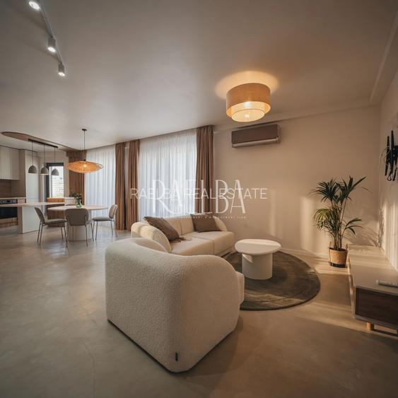 Mobilierul este realizat integral pe comandă, optimizat pentru fiecare zonă a apartamentului, iar bucătăria este complet echipată și pregătită pentru utilizare imediată. Ușile interioare de tip Filomuro contribuie la un aspect fluid și curat al spațiului, iar băile sunt echipate cu obiecte sanitare de la Ideal Standard, inclusiv o cadă freestanding care adaugă un plus de confort și rafinament. Apartamentul beneficiază, de asemenea, de dotări moderne precum mașină de spălat și uscător, integrate discret în ansamblu.