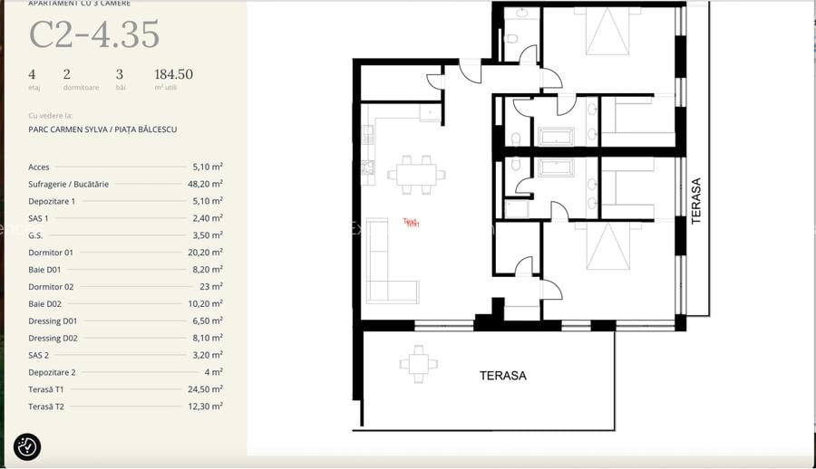 Vă propunem spre vânzare un apartament de lux, cu o suprafață generoasă de 184,5 mp, situat într-o zonă ultracentrală, ideală pentru un stil de viață exclusivist. Proprietatea impresionează prin finisaje premium, materiale de cea mai bună calitate și un design interior modern, atent gândit în cele mai mici detalii. Apartamentul este amplasat într-o locație unică, chiar în inima Timișoarei, oferindu-ți acces rapid la toate punctele de interes majore ale orașului. Situat la doar 5 minute de mers pe jos de Catedrala Mitropolitană din Timișoara și la o distanță foarte scurtă de principalele zone culturale, comerciale și de recreere, complexul rezidențial îți permite să te bucuri de toate avantajele vieții urbane vibrante, fără a sacrifica liniștea și confortul. Apartamentul se află la etajul 4, compartimentarea este eficientă și confortabilă. Apartamentul se află într-un imobil nou, cu lift, având posibilitatea de a achiziționa parcare subterană și opțiune de sistem smart home. Apartamentul are o înălțime liberă de 3,2 metri, care îți oferă o senzație de spațiu și deschidere, făcând camerele să pară mai mari și mai luminoase. Acest sentiment de volum sporit este esențial în designul de lux, unde confortul și senzația de libertate sunt prioritare. Înălțimea suplimentară oferă posibilități extinse de decorare, permițând integrarea unor elemente de design impresionante, precum lustre mari, corpuri de iluminat suspendate de lux sau scafe decorative, care contribuie la atmosfera rafinată a spațiului. Sistemele de pompe de căldură de înaltă performanță Mitsubishi Heavy sau echivalent,alimentate de panouri fotovoltaice avansate,oferă o reducere semnificativă a costurilor energetice. Această combinație inteligentă asigură majoritatea energiei necesare,transformând căminul tău într-un spațiu eco-friendly și extrem de economic, comparativ cu sistemele tradiționale pe gaz. În plus, pentru un climat perfect pe tot parcursul anului, sistemele multi-split oferă răcire eficientă și fiabilă. La Cassa Exclusive Residences, confortul și tehnologia se îmbină armonios pentru a crea o experiență de locuire unică. De la spațiile largi și luminoase până la soluțiile eco-friendly și sistemele inteligente de control al casei, fiecare detaliu este conceput pentru a îmbunătăți viața de zi cu zi. Fie că te relaxezi în jacuzzi-ul privat de pe acoperiș, te bucuri de o seară pe terasa ta generoasă sau te întorci acasă la un apartament inteligent și sustenabil, aici vei experimenta exclusivitatea în fiecare moment. Prețul este de 561.000 euro și nu conține TVA.