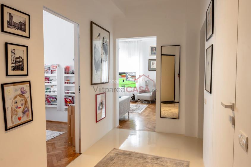 Parchetul din lemn masiv si usile glisante din nuc au fost restaurate atent, completate de usi interioare Filomuro si mobilier realizat pe comanda (inclus partial in vanzare).