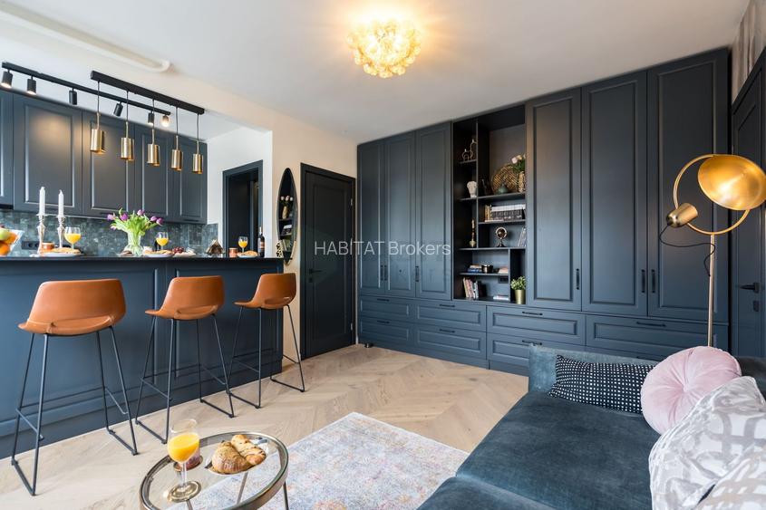 Livingul și Bucătăria Open-Space: Un spațiu fluid și luminos, dominat de mobilier realizat pe comandă în nuanțe rafinate de albastru marin/antracit, contrastând perfect cu parchetul din lemn dispus în stil chevron. Zona de bar, cu scaune de piele și accente de iluminat aurii, este locul ideal pentru un mic dejun prelungit sau un pahar de vin savurat seara, privind pulsul orașului de la înălțime.