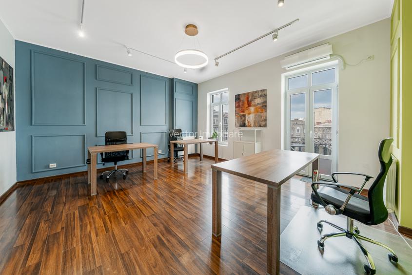 Spațiu generos de aproximativ 33 mp, configurat eficient pentru activitatea unei echipe dinamice, poziționat într-un cadru business stabil, cu acces facil către Piața Universității, Piața Rosetti și principalele artere ale orașului