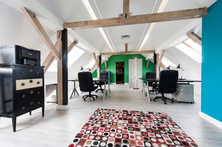 Spatiul disponibil se afla la mansarda, o suprafata inchiriabila de 160mp compusa din spatiu deschis, o partitie de sticla, bucatarie si grupuri sanitare. Se preda precum in poze.