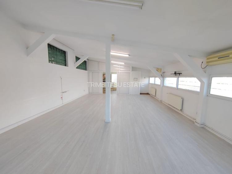Etajul are trei zone ,zona principala de 60 mp si doua birouri unul de 10 mp si respectiv 20 mp la acestea se adauga si 2 grupuri sanitare.