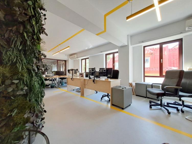 destinatie spatiu de birouri compartimentare open space centrala termica pe fiecare nivel contorizare individuala utilitati pe fiecare nivel( gaze, apa, energie electrica) circuite independente pentru prize si iluminare 2 grupuri sanitare pe nivel 2 cai acces imobil supraveghere video exterioara loc relaxare in curtea imobilului acces securizat