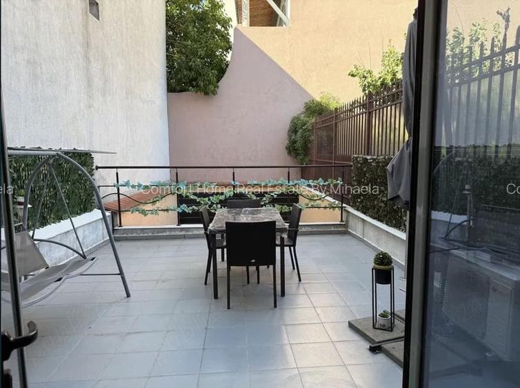 Parter cu deschidere directa prin plierea totala a usilor duble catre terasa proprie , echipata cu umbrela masa si scaune si amenajare loc de fumat.;( total= aprox.90mp);