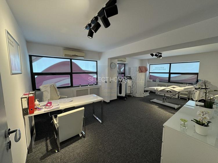 Spatiul este luminos, se afla la parterul unei cladiri de birouri cu fatada de sticla si este compus din: hol intrare, 2 cabinete, receptie si baie. In prezent este amenajat pentru clinica de infrumusetare.