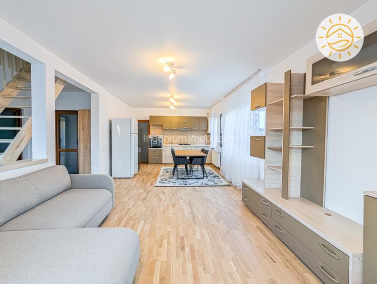 Mobilat-Utilat integral: aparat de dedurizare a apei, centrala termica proprie, izolatie termica, bucatarie mobilata si utilata, frigider, plita, cuptor, masina de spalat vase, masina de spalat rufe.
