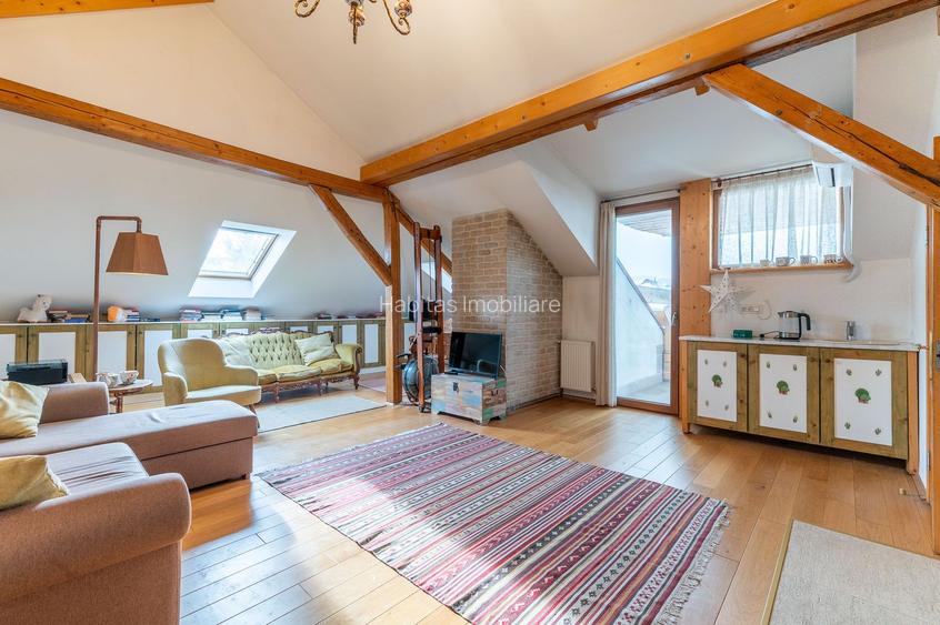 Podul este transformat într-un apartament complet, ideal pentru un birou privat, pentru oaspeți sau pentru un membru al familiei care iubește independența fiind dotata cu o chicineta, un wc de serviciu si dus separat.