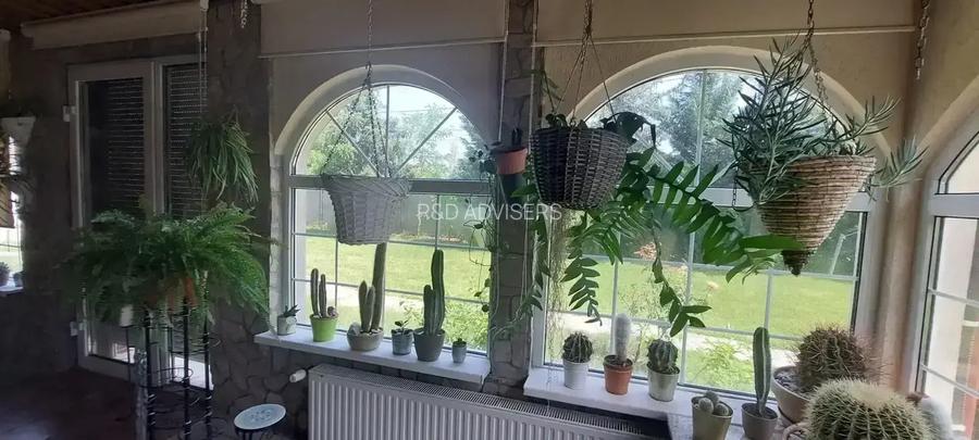 ..Mai departe, ajungem in livingul cu dining (84 mp), unde privirea ta se odihneste pe spatiul larg, mobilat cu gust, cu mobila de lemn facuta pe comanda. Cand afara ploua, e frig, sau ninge, vei dori cu siguranta sa pornesti semineul cu lemne. Livingul face corp comun cu o sera, cu doi palmieri pana la tavan.