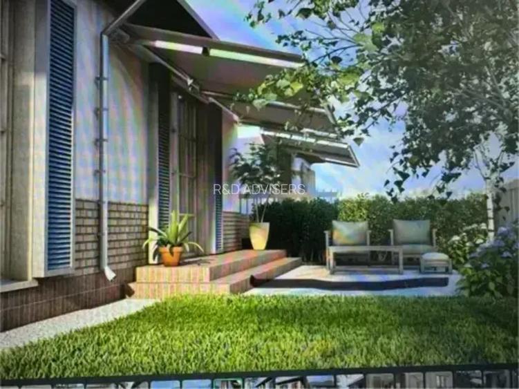 Te vei bucura si de o terasa generoasa, care va fi acoperita cu copertina retractabila furnizata de dezvoltator, iar curtea, cu suprafata totala de 300 mp, iti va permite sa o organizezi cum doresti tu.