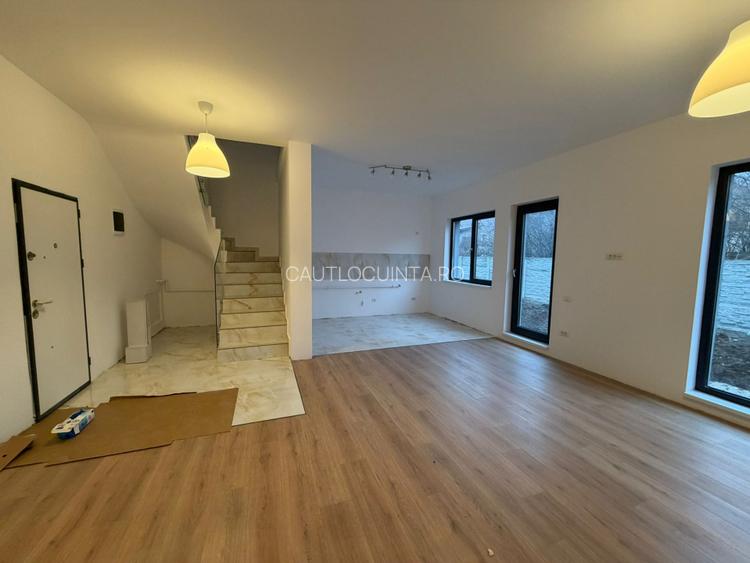 Casa cu 4 camere, living, 3 dormitoare, 1 bucatarie si 3 bai.