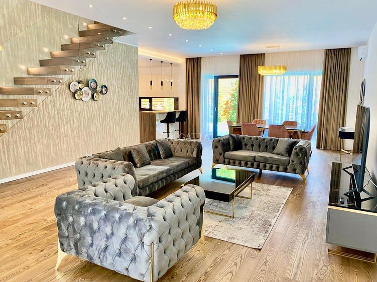 Vila este închiriată complet mobilată și utilată, având un design modern și sofisticat. Bucătăria este complet echipată cu electrocasnice de ultimă generație, iar băile sunt dotate cu mobilier și obiecte sanitare de calitate superioară. Încălzirea în pardoseală asigură confortul termic constant pe tot parcursul anului, iar aerul condiționat este disponibil pentru a menține temperatura optimă în fiecare cameră.