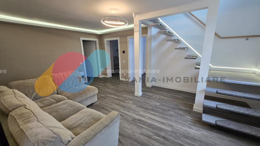 Imobilul este compartimentat eficient si include 5 dormitoare decomandate, un birou cu pereti de sticla ideal pentru lucru de acasa, doua livinguri (unul generos la parter si unul mai mic la etaj), trei bai complet echipate, o bucatarie spatioasa complet mobilata si utilata, doua terase (12 mp si 13 mp), un beci de 16 mp si un pod pe toata suprafata casei, perfect pentru depozitare.