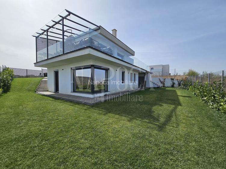Atentia la detalii se observa in fiecare incapere. Atat culorile, mobilierul facut la comanda, materialele si obiectele sanitare folosite in bai, cat si electrocasnicele de inalta calitate au fost alese sub atenta privire a designer-ului. Dar sa trecem acum la punctul forte al acestei proprietati, si anume terasa generoasa de 59,50 mp. Orientarea E-S-V-N iti permite sa beneficiezi de o panorama deosebita asupra orasului, a aeroportului si a comunei Apahida. Imagineaza-ti ca servesti masa, citesti o carte interesanta sub pergola de sticla sau pur si simplu te relaxezi seara savurand bautura preferata in timp ce privesti orasul de sus. Unde mai spui ca avioanele iti ofera un spectacol in fiecare zi? In plus, aceasta panorama nu poate fi obstructionata pe viitor, deoarece la limita din spate a terenului inclinatia creste semnificativ. Iar daca iti doresti o curte si mai mare, exista posibilitatea sa faci asta prin achizitia parcelei invecinate.