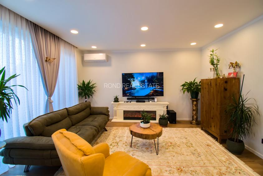 Locuința se vinde complet mobilată și utilată: bucătărie modernă din MDF lucios cu electrocasnice premium, living cu canapea design și șemineu electric, televizoare în fiecare zonă de interes. Totul este pregătit pentru a susține confortul cotidian fără compromisuri.