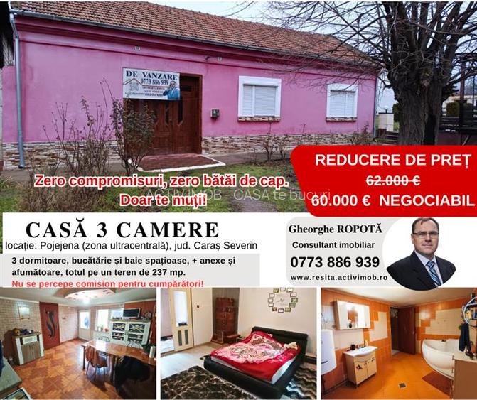 Casa 3 camere zona ultra-centrala in Pojejena – pozitie strategica, curte si anexe