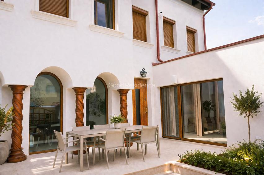 Exteriorul casei reflectă aceeași filozofie ca interiorul: materiale autentice, detalii lucrate și o arhitectură care nu se demodează, realizate fără compromisuri și la un nivel care o diferențiază clar de orice altă proprietate din zonă.