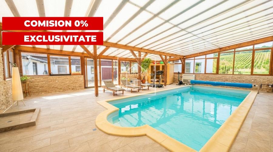 - Corpul secundar este dedicat relaxarii si socializarii: living generos cu bucatarie open space, trei dormitoare, baie completa, grup sanitar de serviciu, o zona wellness privata dotata cu piscina interioara incalzita (9m x 4m, 1,5m adancime / 54 mc de apa) si sauna uscata cu soba electrica Harvia (pana la 90°C).