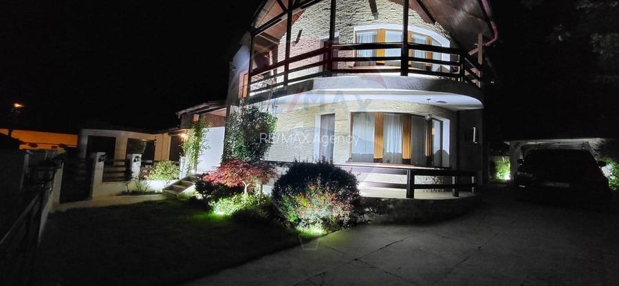 Curtea placata cu travertin si piatra naturala dispune de iluminare nocturna, are un foisor spatios dotat gratar rustic, cuptor si plita electrica cu inductie, spatiul exterior ofera o intimitate placuta datorita gradinii cu vegetatie matura de 8 ani cu gazon, plante si brazi. Plantele si arborii sunt mentinute in cea mai buna forma cu doua sisteme automatizate de irigare.