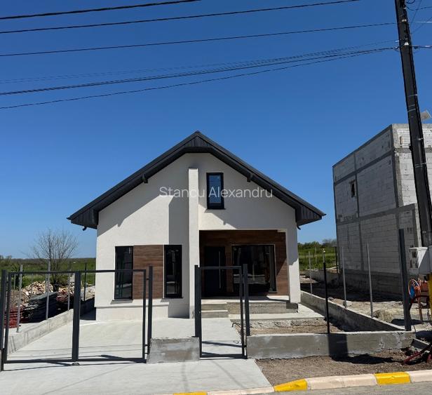 La intrarea în casă ești întâmpinat de un living impresionant, foarte mare, spațios și luminos, cu o suprafață de aproximativ 45 mp, conceput pentru confort și socializare. Pe partea stângă a casei se află un dormitor generos de aproximativ 13 mp, luminat natural de două geamuri, urmat de o baie modernă, ușor accesibilă. Tot pe partea stângă este poziționat dormitorul matrimonial, de aproximativ 23 mp, un spațiu privat bine definit, cu zonă pentru dressing și baie proprie, accesul în baie făcându-se exclusiv din dormitor, acesta beneficiind la rândul său de lumină naturală prin două geamuri. În partea din spate a casei se află bucătăria, configurată open space, cu posibilitate de închidere, care oferă acces direct către terasa din spate, creând o legătură firească între interior și exterior.