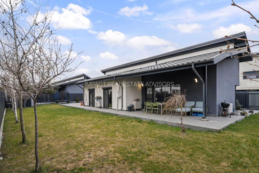 Impact Real Estate Advisors are plăcerea de a vă prezenta o proprietate deosebită, definită prin spații generoase, finisaje de top și o compartimentare inteligentă, ideală pentru o familie numeroasă. Construită în anul 2020, această vilă se remarcă prin conceptul său rar întâlnit pe piața locală: locuință desfășurată exclusiv pe parter, oferind un confort sporit și o conexiune fluidă cu mediul exterior.