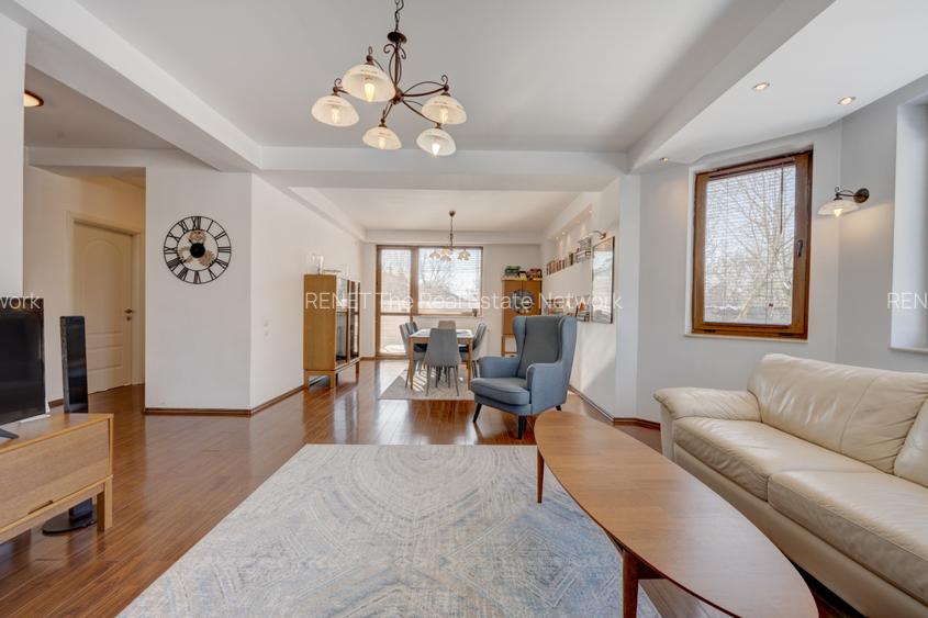 La subsol (19,7mp) este o camera tehnica pentru centrala si un spatiu pentru depozitare amenajat cu rafturi. Bucataria este inchisa, complet mobilata si utilata FRANKE cu toate electricasnicele necesare: plita, cuptor, hota, cuptor cu microunde, masina de spalat vase, frigider, toate incorporate. Tot mobilierul de bucatarie este din lemn masiv. Baia parterului este amenajata cu cabina de dus si beneficiaza de fereastra. Livingul este generos, cu o suprafata de 40 mp si este impartit in doua zone, o zona de dinning cu acces catre terasa exterioara si o zona de relaxare.