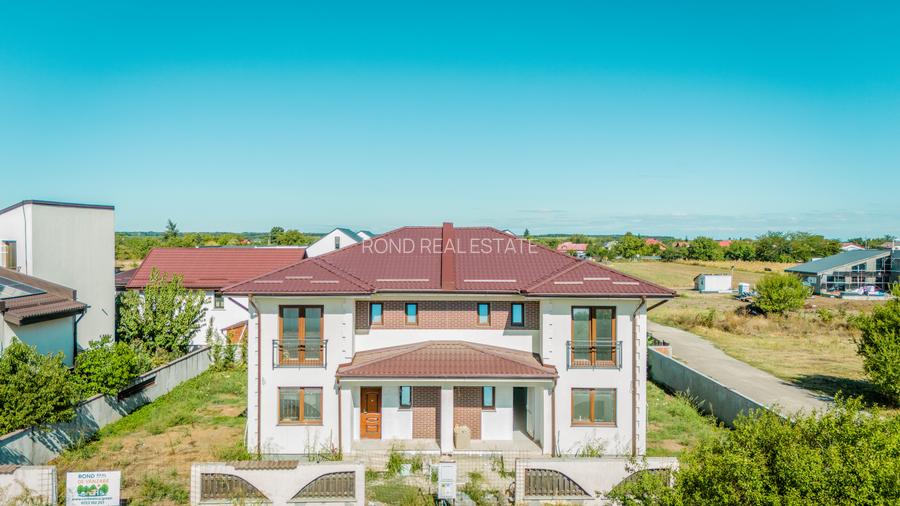 Vila alipita, cu perete dublu si rost umplut cu polistiren de 10cm , EPS 100, eleganta, finalizata in proprortie de 80%, lasand posibilitatea viitorilor clienti de a-si alege parchetul, usile, finisajele in bai si obiectele sanitare. Curtea se va preda amenajata cu sistem de irigatii, gazon insamantat, garduri, zona de parcare auto, trotuare. Exista posibilitatea achizitiei fara finisaje interioare.