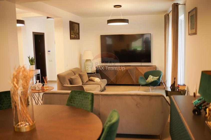Parterul casei este deschis, cu un living spațios și o zonă de luat masa, delimitate elegant de o insulă de bucătărie. Pardoseala încălzită este acoperită cu gresie de calitate superioară marca PORCELANOSA, iar bucătăria este echipată cu mobilă de firmă și electrocasnice premium, perfecte pentru a găti cu plăcere pentru cei dragi. Zona de dining, mobilată cu piese Rovere, adaugă un plus de rafinament. De asemenea, baia de la parter și spațiul de depozitare sub scară, care include o mașină de spălat, completează confortul.