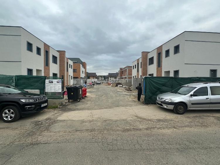 Ansamblul imobiliar ingradit cu strada larga de 7 ml si acces privat, pe un teren cu suprafata generoasa, cuprinde 3 vile tip duplex 6 unitati locative plus o casa individuala, fiecare avand in proprietate terenul aferent in suprafata de 214 mp ( amprenta imobilului la sol este 82 mp ) + 76 mp teren cota comuna per unitate (sunt circa 600 mp in interiorul complexului detinuti in comun – drum/spatiu verde).
