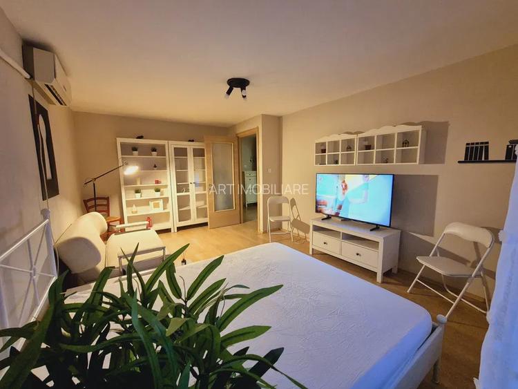 Garsoniera este mobilata, pat dublu 160x200 si canapea, dulap pentru haine pe hol. Bucataria este utilata cu: plita pe gaz, cuptor electric, hota, frigider, masina de spalat rufe. Aer conditionat, televizor LG 4K Smart, ferestre cu geam termopan, usa metalica. Scara blocului este curata si monitorizata video.