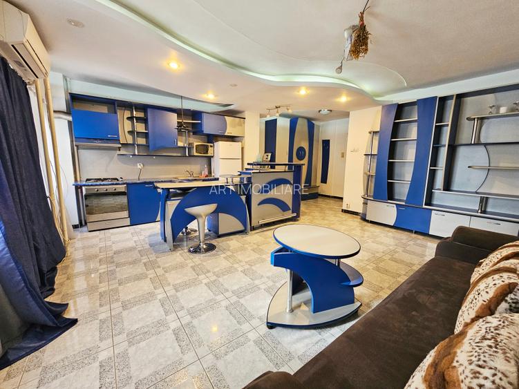 Garsoniera este mobilata, canapea extensibila, dulap pentru haine, bucataria este deschisa si este utilata cu: plita pe gaz, cuptor electric, hota, frigider, masina de spalat rufe. Aer conditionat, ferestre cu geam termopan, usa metalica.