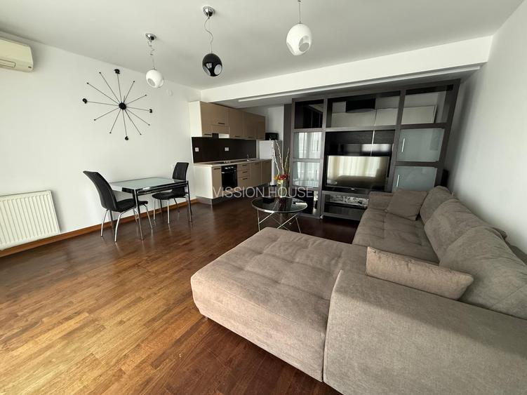 Compartimentarea este practică și aerisită, cu bucătărie open-space integrată în zona de zi, spațiu ce beneficiază de lumină naturală din plin și acces direct către balcon. Apartamentul este dotat cu aer condiționat pentru confort în sezonul cald și beneficiază de încălzire centralizată de bloc.