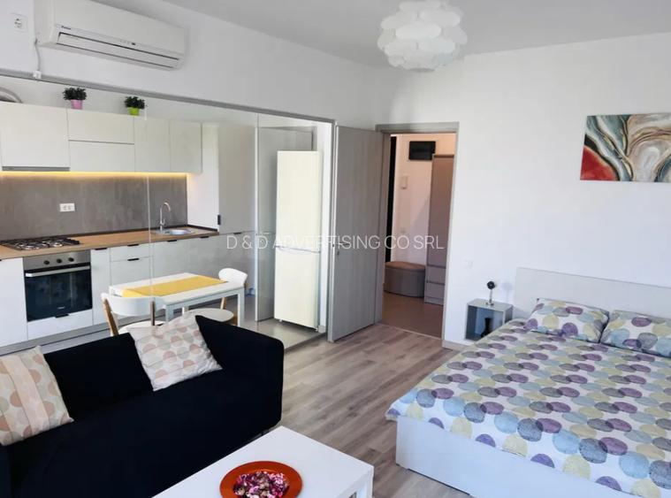 Garsoniera este mobilata si utilata complet cu centrala termica proprie, TV LCD, aer conditionat, frigider, plita pe gaz, cuptor, hota, masina de spalat rufe. Dispune de balcon.