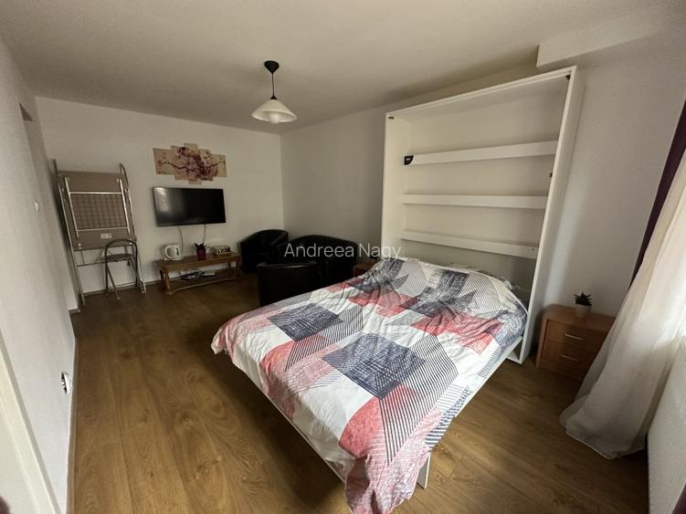 Garsoniera complet mobilată, localizata la parterul blocului, centrala proprie pe gaz, utilitati, baie, bucătărie.