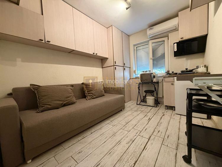 Iulius Imobiliare ofera inspre inchiriere o garsoniera micuta de 20 mp, baie, bucatarie deschis. Este utilata si mobilata cu plita electrica, cuptor cu microunde, masina japoneaza de spalat rufe, TV, canapea extensibila. Este ideal pentru o persoana care vrea sa economiseasca bani, si vrea un loc mic dar linistit.