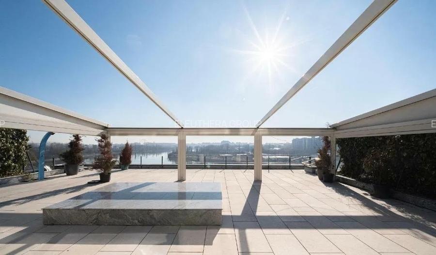 Terasa unica 165 mp cu pergola retractabila de 100 mp si senzori pentru vant, jardiniere laterale pentru intimitatea cu vecinii, inalte de 2,5 m cu sistem automat de aspersoare, dus solar, pardoseala flotanta, lumini ambientale. Orientare spre sud, priveliste direct spre lacul si parcul Tei si spre Complexul Pescariu.