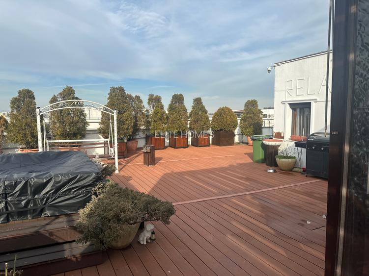Terasa este un adevărat refugiu urban, dotată cu jacuzzi, zonă parțial acoperită cu sticlă specială ce respinge căldura, iluminare ambientală și multiple zone de relaxare. Există 3 ieșiri directe din apartament către terasă, asigurând o legătură fluidă între interior și exterior.
