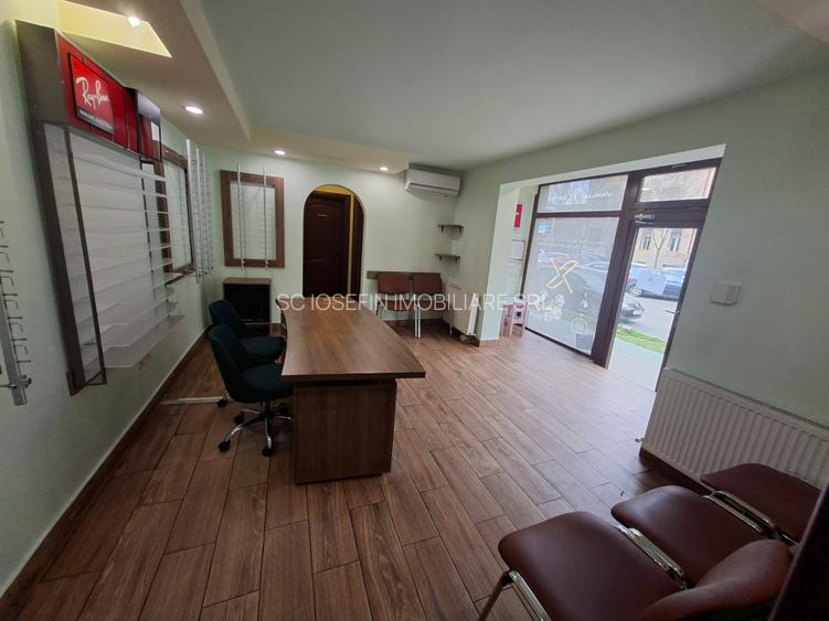 Spatiu cu vitrina, fost cabinet medical, compartimentat conform normelor in vigoare, cu 2 incaperi separate, 2 bai si sala de asteptare spatioasa, intrare din strada. Fiecare incapere este prevazuta cu lavoar si aer conditionat. Spatiul are intrarea principala din strada, front stradal vizibil, strada cu trafic pietonal si parcari amenajate.