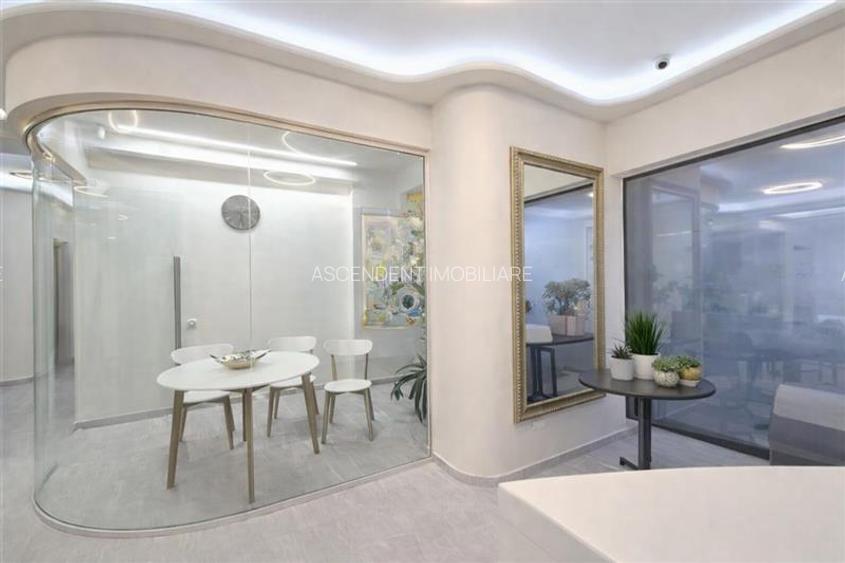 Cu o suprafata utila de 196 mp, este conceput si compartimentat special pentru activitati medicale, fiind ideal pentru cabinet stomatologic, clinica medicala ambulatorie, centru de recoltare analize sau concept medical integrat. Functionalitatea este completata de dotari tehnice premium: racordare la reteaua urbana de apa si canalizare, sistem generalizat de prefiltrare a apei in trei etape, centrala termica proprie pe gaz, incalzire in pardoseala, sistem de ventilatie cu recuperare de caldura si filtrare a aerului, precum si aer conditionat.