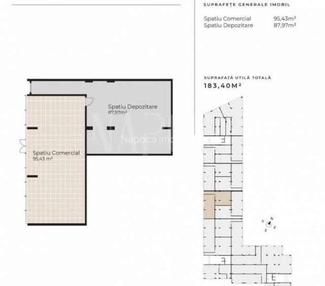 Spatiu comercial de 183 mp, in zona Sopor! Va propunem spre vanzare un spatiu situat in Sopor, zona Bazei Sportive Gheorgheni, zona rezidentiala, intr-un imobil ce urmeaza sa fie finalizat catre finalul anului 2026. Spatiul propus se desfasoara pe o suprafata utila de circa 183 mp, avand urmatoarea dispunere: - 1 zona principala; - 1 zona de depozitare. Proprietatea dispune de suprafete vitrate generoase, astfel fiind pretabil pentru numeroase activitati: servicii medicale, showroom, magazin, saloane si altele similare . La pretul afisat se adauga TVA! Pentru a programa o vizionare si pentru o consultanta imobiliara de calitate, va stam cu drag la dispozitie! Echipa Napoca Imobiliare ID oferta: 156412 Nr grupuri sanitare: 1 Nr incaperi: 2 Utilitati - Acces internet (Cablu,Fibra optica,Wireless); Utilitati generale (Curent,Apa,Canalizare,Gaz) pretvanzare: 495000 monedavanzare: EUR monedavanzaremp: Disponibilitate proprietate: neprecizat