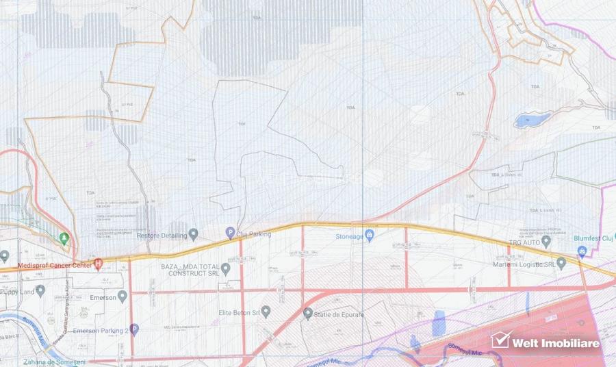 Situat in unitate teritoriala TDA - Terenuri cu destinație agricola - arabil, pașuni, fanețe situate in extravilan, terenul este in proximitatea limitei intravilanului orasului, cu planeitate si view peste Aeroport si Somes, ceea ce il face atractiv ca investitie in vederea unei viitoare intrari in intravilan.